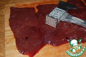 Печень очистить от пленок, разрезать на пластины и немного отбить.