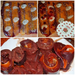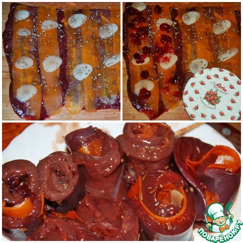 Морковь также нарезать пластинами при помощи овощечистки. Для лучшей эластичности моркови нужно ее бланшировать в кипятке 2-3 мин., затем обдать холодной водой. На пласты печени уложить морковь, тонко нарезанный хлопьями чеснок, специи и немного клюквенного соуса D’arbo. Каждый пласт печени свернуть рулетом, разрезать на кусочки по 3 см и нанизать на деревянные шпажки. Приготовить можно любым привычным для вас способом: обжарить на сковороде с добавлением масла или, как я, на гриле.