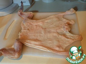 Вот таким образом я отделила кожу от курицы, оставив только крылья. Остается после такого способа только 2 дырки- в области шеи и попки.
