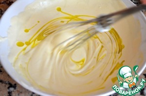 6. Постепенно влить 100 мл растительного масла, продолжая взбивать соус до получения гладкой однородной эмульсии.