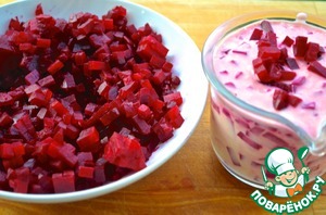 1. Разогреть духовку до 200С. Залить свеклу холодной водой, добавить щепотку соли, довести до кипения и готовить на среднем огне до мягкости 50 – 60 минут. Готовую свеклу остудить, очистить от кожицы и порезать на маленькие кубики.