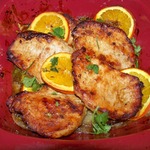 Апельсин обдать кипятком, обсушить, тонко нарезать кружочками. Выложить апельсин в форму для запекания. Посолить, поперчить, посыпать мелко нарезанным чили. Запекать при 180* 30 минут в режиме полуконвекции. Каждые 10 минут поливать медальоны соусом со дна формы.