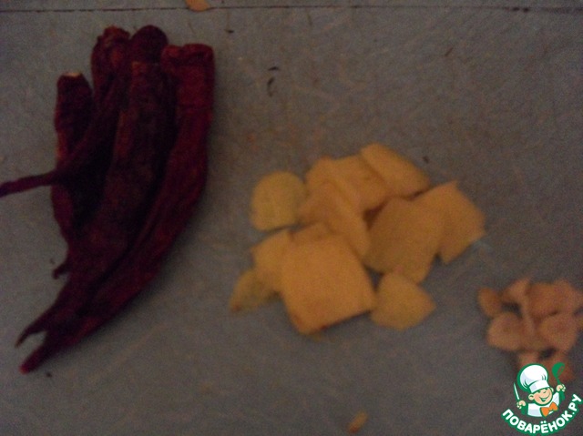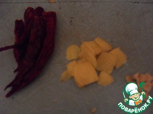 Вычистить семена у перцев, очистить имбирь и чеснок и нарезать пластинками