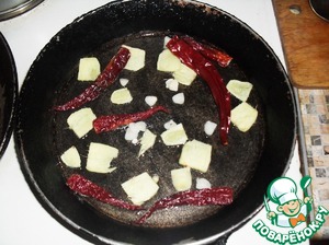Обжарить перец, чеснок и имбирь на 2 ст. л. того масла, что было во фритюре