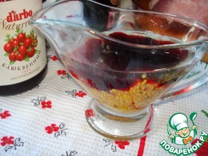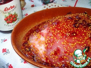 Смешаем горчицу с клюквенным соусом от D'arbo. Добавим коньяк, имбирь. У меня был кусочек, который не пришлось связывать ниткой, он был компактный, можно сказать симпатичный и не особенно большой. Если у вас кусок больше, то рекомендую придать ему форму и обвязать толстой ниткой.