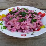 Залить соусом нарезанную свеклу, перемешать. Салат готов.