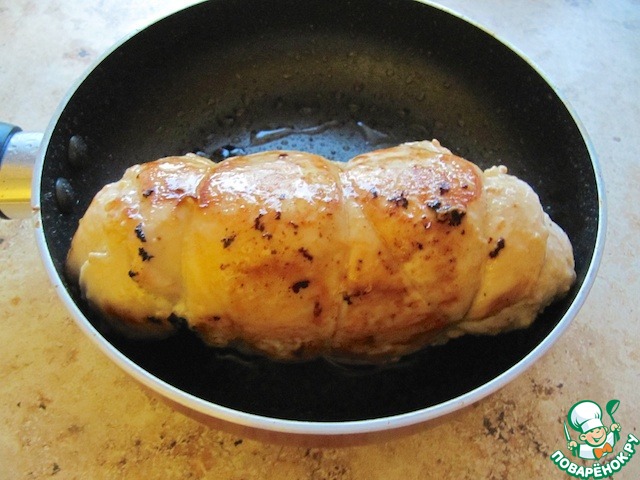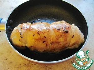 Разогреть сковородку с растительным маслом IDEAL Подсолнечный, выложить рулет и быстро (чтобы мясо не потеряло сочность!) обжарить до золотистого цвета со всех сторон.