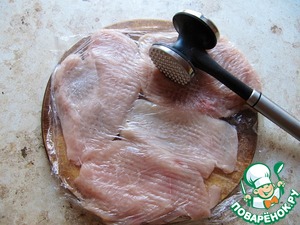 Завернуть филе рулетом. Для крепости рулета можно обернуть еще одним слоем отбитого филе. Рулет закрепить кулинарной нитью.