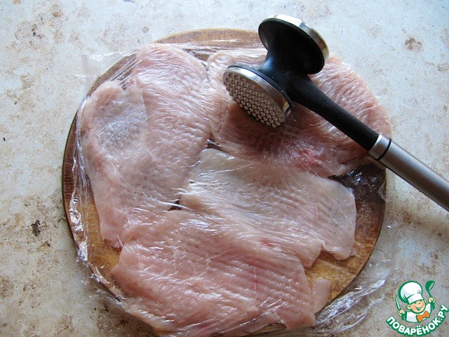 Филе курицы (индейки) отбить тонко, но нужно избежать разрыва филе, посолить по вкусу, добавить перец.