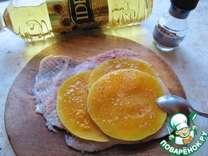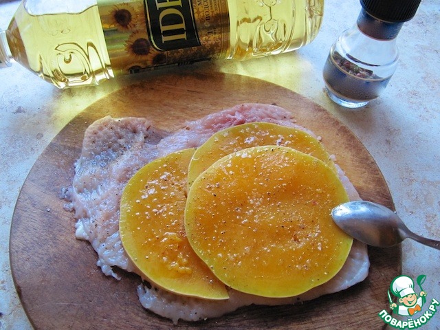Сверху филе выложить пластины тыквы (можно в несколько слоев), тыкву смазать для сочности растительным маслом IDEAL Подсолнечный, слегка посолить, поперчить.