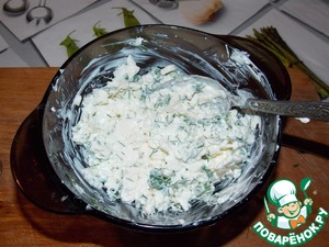 Трем плавленный сыр, режем мелко чеснок и зелень, добавляем ложку сметаны и все перемешиваем.