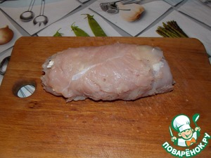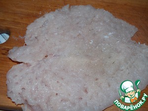Затем берем куриное филе отбиваем его, солим и перчим.
