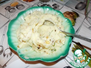 Как картофель сварился, добавляем оставшуюся сметану, сливочное масло и мнем его... Затем обжариваем лук и добавляем его к картофелю и немного укропа.