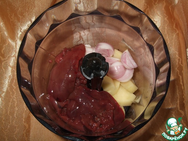 • Приготовим фарш-измельчим печень, картофель, лук-кому как удобно-можно блендером, можно через мясорубку.