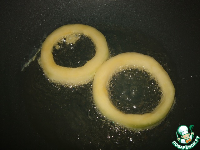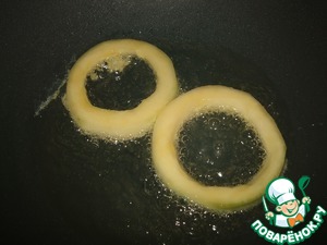 • Переворачиваем и к середину кабачка кладём печёночный фарш. Жарим минутки 4-5.