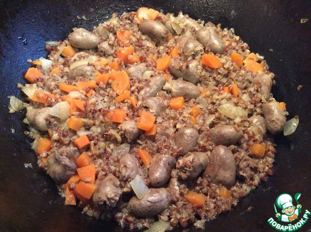 Рецепт «Гречка с куриными сердечками в горшочках»: