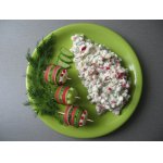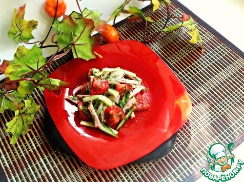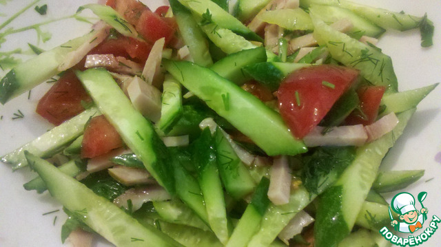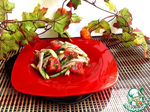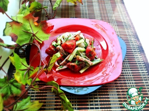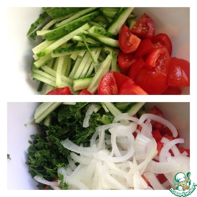 Огурцы режем соломкой, помидоры на четвертинки. Укроп мелко шинкуем. Лук режем полу кольцами и ошпариваем кипятком. Даем остыть и добавляем к салату