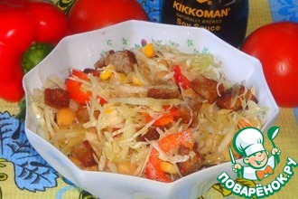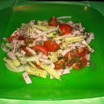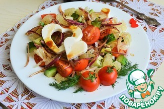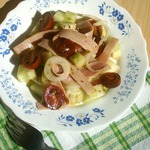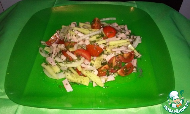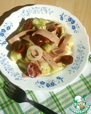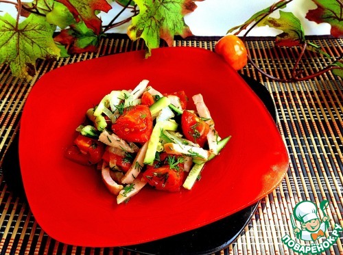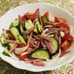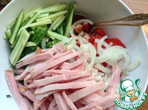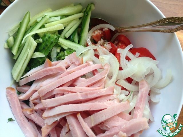 Совершенно вкуснющий и яркий овощной салат с ветчиной. Заправка ароматная и очень аппетитная.