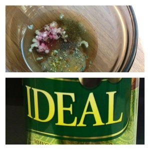 Делаем заправку: масло, соль, орегано, перец, уксус и пропущенный через пресс чеснок перемешиваем. Заправляем салат и аккуратно перемешиваем.