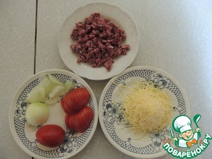 Колбасу нарезаем кубиками, лук и помидоры нарезаем полукольцами, сыр натираем на мелкой терке...