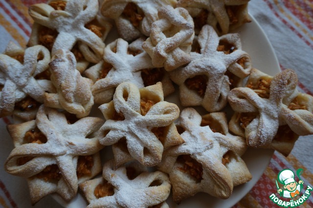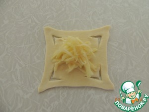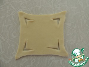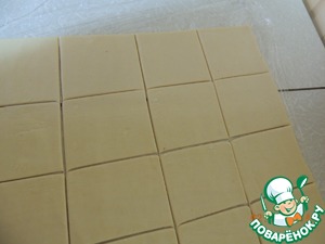 Тесто нарезать квадраты, я обычно покупаю тесто уже порезано квадратами...