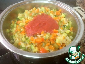 Поджарим на подсолнечном масле "Идеал" и добавим томатную пасту. Тушить на медленном огне 15 минут