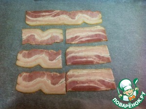 Закрыть пекарской бумагой и сверху прижать какой-нибудь формой, чтобы бекон не свернулся трубочкой. Выпекать в духовом шкафу 10 минут при 180 градусах