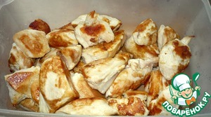 Мясо промыть под проточной водой и просушить бумажным полотенцем. Нарезать на порционные кусочки (можно брать любую часть курицы, но я люблю только белое мясо). Обжарить их на сухой сковороде на среднем огне. Сначала мясо, конечно, пристанет к сковороде, но когда подрумянится, то само отойдет от поверхности.
