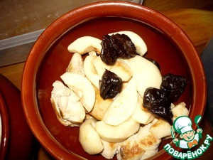 Сложить обжаренную курицу, кусочки груши и чернослив в горшочки. Добавить соль, перец и карри. Перемешать.