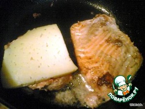 На раскаленной сковороде растопить сливочное масло, обжарить филе форели (3-5 мин) с одной стороны, перевернуть, положить ломтик сыра на каждый кусок форели.