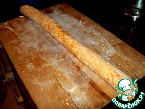 Раскатываем из полученного теста колбаску, и нарезаем на кусочки.