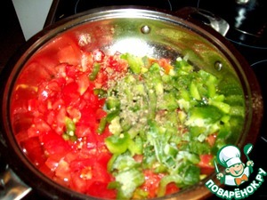 Соус. Помидоры и перец мелко нарезаем. выкладываем на сковороду с растительным маслом, солим, перчим, добавляем орегано, перемешиваем и тушим минут пятнадцать.