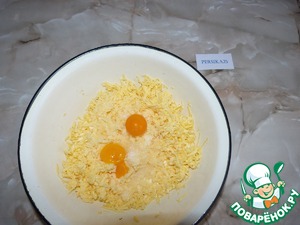 • Сначала разомните масло (у меня было замороженное и я его натерла на терке), соль, сахар, желтки и молоко в однородную массу.