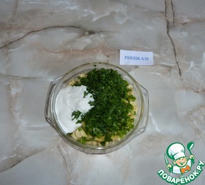 • Для начинки грибочки нужно нарезать на кусочки, лук и зелень (петрушка, укроп) нашинковать, добавить сметаны и перемешать.