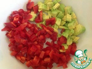 Болгарский перец нарезаем мелким кубиком как и авокадо, предварительно очищенный