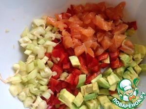 Сельдерей нарезаем мелким кубиком, с семгой проделываем тоже самое