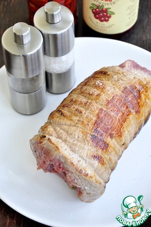 Обжарить на оливковом масле до румяной корочки со всех сторон. Посолить и поперчить верх рулета. Довести до готовности в предварительно разогретой духовке при 180* 30 минут. В этом случае мясо получится медиум. Если любите хорошо прожаренное мясо, тогда готовьте 70-80 минут. Время от времени поливать рулет выделившимся соком. При подаче не забудьте снять нитки.