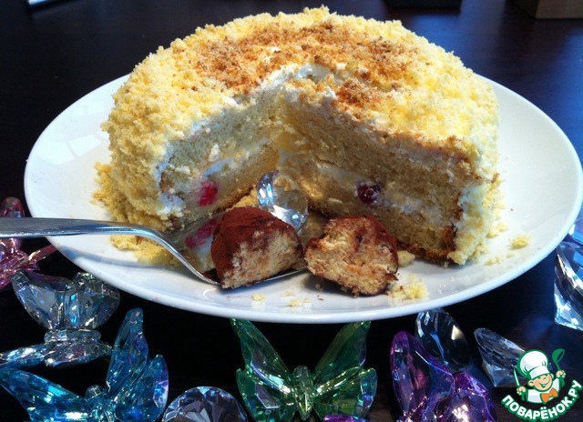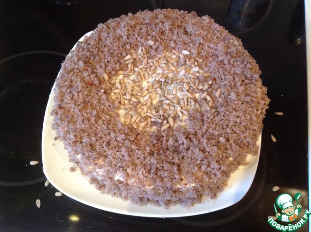 Тонкий корж измельчить в крошку.