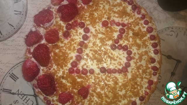 На нижний корж нанести крем и разложить ягоды, сверху положить верхний корж.
