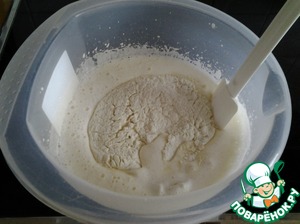 К яичной массе аккуратно добавляем смешанную с содой муку.
