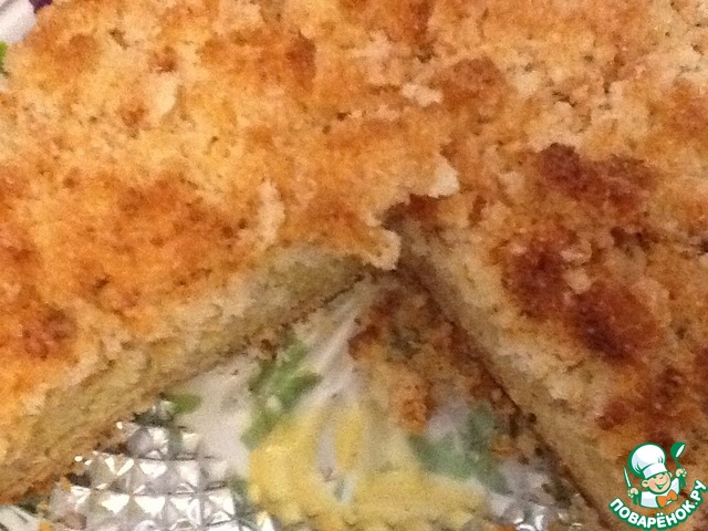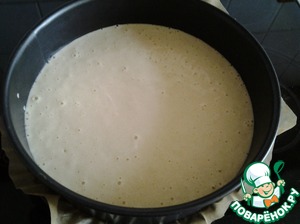 Тем временем на пироге образовалась корочка и края едва зарумянились. Достаем полуготовый пирог из духовки, быстро заливаем его кокосовой заливкой, равномерно распределяя ее по поверхности.