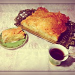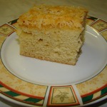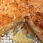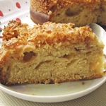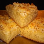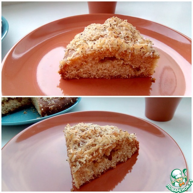 [+4]Мой пирог поднялся неравномерно, на фото заметно полость. Но структура очень понравилась - рассыпчатая, с ароматной кокосовой крошкой (не могу сказать, что во время выпечки соседи оккупировали мою дверь