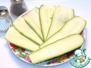 • Затем нарезаем кабачок пластинами, солим и обжариваем.