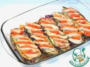 • На баклажан выкладываем сверху 1/2 часть перца.