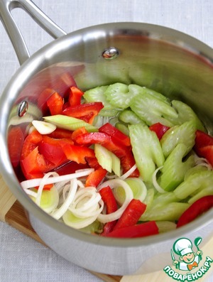 В сотейник налить 2-3 ст. л. оливкового масла, обжарить нарезанные овощи.