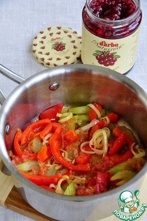 Влить бульон, добавить тыкву, брусничный соус. Готовить минут 10. Посолить, поперчить, добавить щепотку сахара. Пюрировать блендером до однородного состояния.