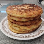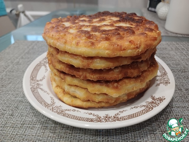 Пока жарится одна лепёшка, делаем другую. Надо обжарить лепёшку с двух сторон и в это время успеть сделать другую.