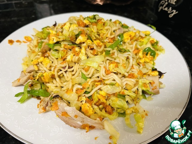 Готовить еще полторы минуты, постоянно помешивая, при необходимости добавьте воды, лапша должна не должна быть сухой, высохшей.