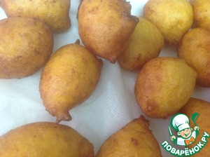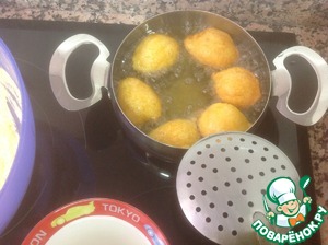 Для жарки подготовим небольшую чашку с водой, разогреем подсолнечное масло "Ideal". Столовую ложку обмакиваем в воде и набираем тесто с горкой-опускаем в горячее масло.