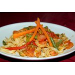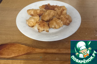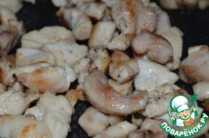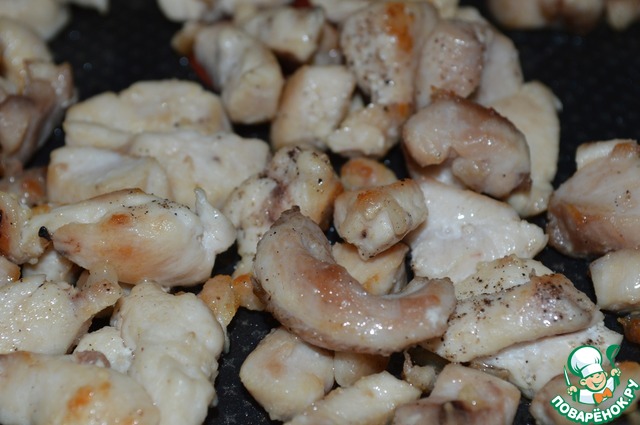 Филе режем на кусочки и быстро обжариваем на сильном огне, на растительном масле, до легкого зарумянивания.